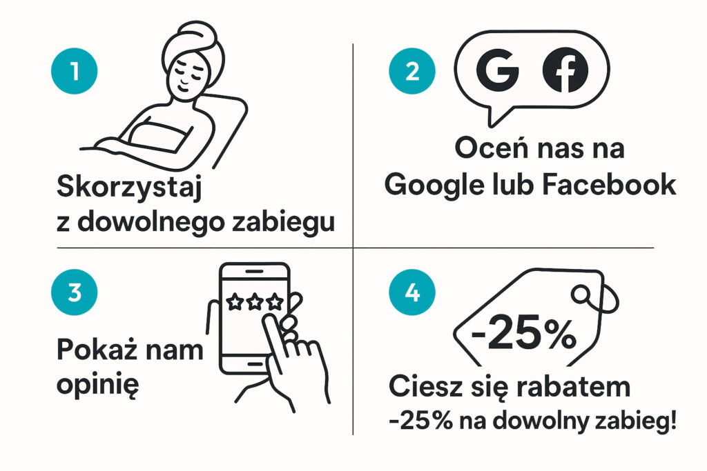 3.1. Za wystawienie opinii klient otrzymuje 25% zniżki na jeden dowolnie wybrany zabieg.